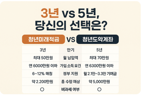 2025년 청년 재테크 핵심! 3년짜리 청년미래적금과 5년짜리 청년도약계좌의 금리, 조건, 혜택을 비교해 당신에게 맞는 상품을 찾아보세요.