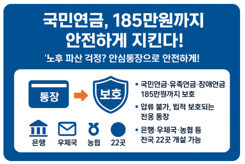 국민연금 수급자라면 '안심통장'으로 연금을 안전하게 보호할 수 있습니다. 계좌 압류 걱정 없이 최대 185만원까지 안전하게 수령하는 방법을 알려드립니다.