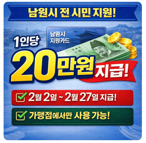 전북 남원시가 모든 시민에게 1인당 20만 원의 민생안정지원금을 지급합니다.