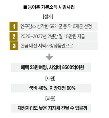 정부가 농어촌 기본소득 시범사업을 추진합니다. 인구감소가 심각한 6개 군을 선정해 2026~2027년 2년간 모든 주민에게 **월 15만원(지역사랑상품권)**을 지급하는 내용입니다. 그러나 군청이 30%의 예산을 분담해야 하는 구조가 지방재정에 큰 부담을 줄 수 있다는 지적도 나옵니다. 본문에서 대상, 신청 일정, 기대 효과, 재정 문제를 자세히 살펴봅니다.
