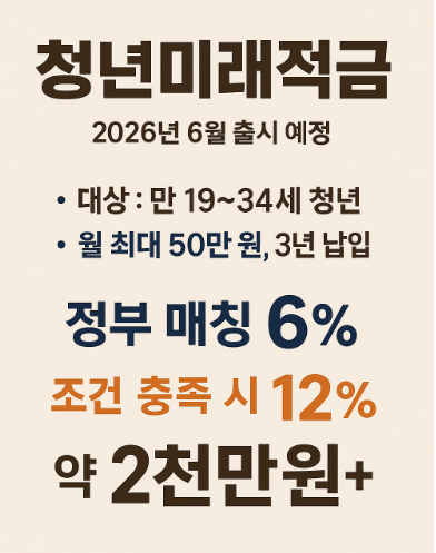 2026년 6월 출시 예정인 청년미래적금은 만 19~34세 청년에게 목돈 마련 기회를 제공하는 정부 지원 적금입니다. 매달 최대 50만 원을 3년간 납입하면 정부가 기본 6%, 조건 충족 시 최대 12%까지 매칭 지원해 만기 시 약 2천만 원 이상의 자산 형성이 가능합니다. 청년층의 금융 부담 완화와 안정적 저축 습관 형성에 큰 도움이 될 것으로 기대됩니다.