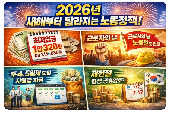 2026년 새해를 맞아 최저임금 인상, 실업급여·출산휴가 급여 상향, 주 4.5일제 지원, 근로자의 날 → 노동절 명칭 변경, 제헌절 공휴일 부활 가능성 등 노동정책 전반에 큰 변화가 예고돼 있습니다.