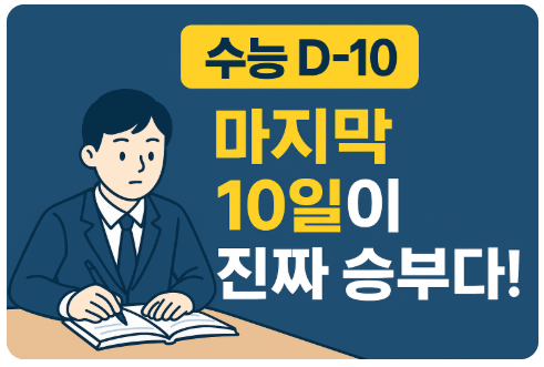 수능 D-10, 성적보다 중요한 것은 컨디션 관리입니다. 생체리듬 조절, 뇌 활성화 식단, 복식호흡, 레이어드 복장, 건강 간식 등 마지막 10일 역전 전략을 소개합니다.