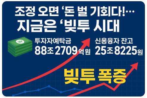 국내 증시가 조정을 맞자 개인투자자들이 대거 자금을 투입하며 ‘빚투’가 다시 고개를 들었다. 투자자예탁금과 신용융자 잔고가 모두 사상 최고치를 경신하며, 과열과 변동성에 대한 우려가 커지고 있다.