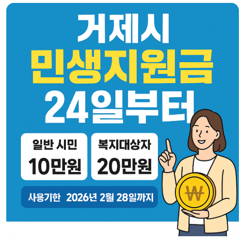 경남 거제시가 모든 시민을 대상으로 한 민생회복지원금 지급을 오는 11월 24일부터 본격적으로 시작합니다. 이번 지원금은 지역 경제 회복과 소비 촉진을 목표로 마련된 만큼, 대상자와 신청 기간, 지급 방식 등을 정확히 확인하는 것이 중요합니다.