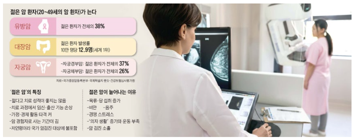 최근 통계에 따르면 한국의 20~40대 암 환자가 빠르게 증가하고 있습니다. 특히 유방암과 대장암, 자궁암 같은 ‘젊은 암’(young cancer) 환자 비율이 세계적으로도 높은 수준을 보이고 있습니다.