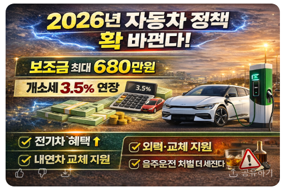 전기차 보조금 확대부터 개별소비세 인하 연장, 음주·약물운전 처벌 강화까지 놓치면 손해 볼 수 있는 핵심 정책을 정리했습니다.