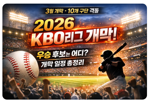 2026년 봄, 대한민국 프로야구의 열기가 다시 달아오릅니다. 2026 KBO리그 개막 소식과 함께 야구팬들의 기대도 최고조에 달하고 있는데요. 이번 시즌은 전력 보강, 신인 돌풍, 외국인 선수 변화 등 다양한 변수로 어느 해보다 치열한 순위 경쟁이 예상됩니다.